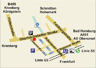 Die Praxis befindet sich im Zentrum von Oberursel gegenüber der Polizeistation und der Tiefgarage der Stadthalle. U- und S-Bahn sind ca. 7 Gehminuten entfernt.